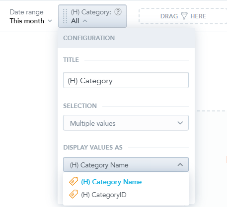 5. To customize the attribute filter such as changing its display name, the type of selection, and the way the individual attribute’s values are displayed, click the attribute filter, and then click the Configuration icon. The Configuration properties box opens. You can do the following:
