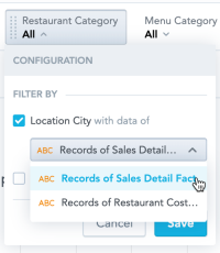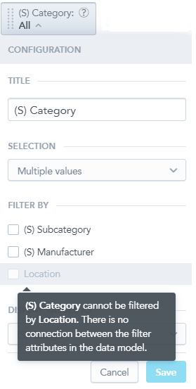 • You cannot connect a parent filter back to the child. This applies also to connections through other filters as well. For example, if you filter Subcategory by Category, you cannot configure Category to be filtered by Subcategory.